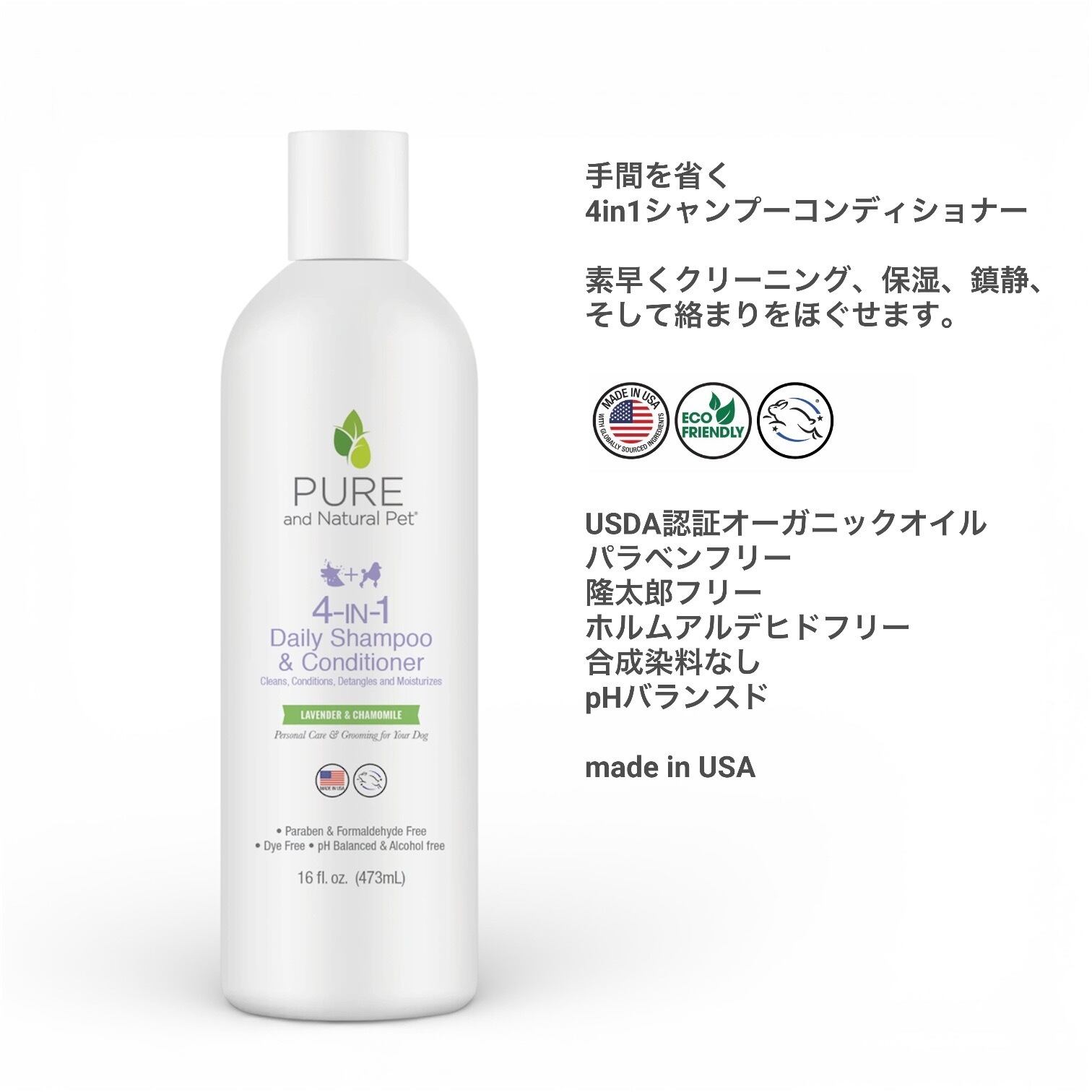 PURE and Natural Petから、ラベンダーとカモミールを使った、爽やかな香りを楽しめるシャンプー&コンディショナーの紹介です。